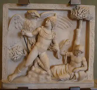 Ganymede and Zeus in the guise of an eagle were a popular subject on Roman funerary monuments with at least 16 sarcophagi depicting this scene.[43]