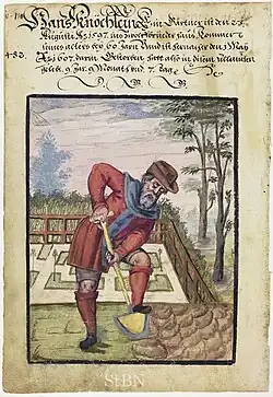 Regardless of historical time period, location, scale, or type of garden, all gardening requires some basic tools.[59] For the majority of human history, people have managed with significantly fewer resources compared to modern times. Agriculture was built on the use of hands, stones, sticks, human ingenuity, and fire.[60] The essential tools used in pre-Bronze Age gardening were non-metal (primarily stone, bone, wood, or copper) knives, axes, adzes, foot ploughs, sickles, hoes, baskets, pottery, digging sticks, animal-driven ploughs, animals, and fire for clearing land.[8][61][62][63] Up until the green revolution, these simple tools, although continually improved upon, would continue to be the backbone of agricultural societies.[64]