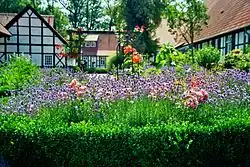 Cottage gardens, which emerged in Elizabethan times, appear to have originated as a local source for herbs and fruits.[41] One theory is that they arose out of the Black Death of the 1340s, when the death of so many laborers made land available for small cottages with personal gardens.[42] According to the late 19th-century legend of origin,[43] These gardens were originally created by the workers who lived in the cottages of the villages to provide them with food and herbs, with flowers planted among them for decoration. Farm workers were provided with cottages that had architectural quality set in a small garden—about 1 acre (0.40 hectares)—where they could grow food and keep pigs and chickens.[44]