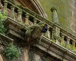 In architecture, and specifically Gothic architecture, a gargoyle (/ˈɡɑːrɡɔɪl/) is a carved or formed grotesque[1]: 6–8 with a spout designed to convey water from a roof and away from the side of a building, thereby preventing it from running down masonry walls and eroding the mortar between. Architects often used multiple gargoyles on a building to divide the flow of rainwater off the roof to minimize potential damage from rainstorms. A trough is cut in the back of the gargoyle and rainwater typically exits through the open mouth. Gargoyles are usually elongated fantastical animals because their length determines how far water is directed from the wall. When Gothic flying buttresses were used, aqueducts were sometimes cut into the buttress to divert water over the aisle walls.[2]