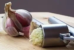 The phytochemicals responsible for the sharp flavor of garlic are produced when the plant's cells are damaged. When a cell is broken by chopping, chewing, or crushing, enzymes stored in cell vacuoles trigger the breakdown of several sulfur-containing compounds stored in the cell fluids (cytosol).[14] The resultant compounds are responsible for the sharp or hot taste and strong smell of garlic. Some of the compounds are unstable and continue to react over time.[15]