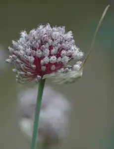 Garlic is a perennial flowering plant that is native to Central Asia, South Asia and northeastern Iran.[1][4] It grows from a bulb, with a tall, erect flowering stem that reaches up to 1 m (3 ft). The leaf blade is flat, linear, solid, and approximately 1.25–2.5 cm (0.5–1.0 in) wide, with an acute apex. The plant may produce pink to purple flowers from July to September in the Northern Hemisphere. The bulb has a strong odor and is typically made up of 10 to 20 cloves. The cloves close to the center are symmetrical, and those surrounding the center can be asymmetrical. Each clove is enclosed in an inner sheathing leaf surrounded by layers of outer sheathing leaves.[11] If garlic is planted at the proper time and depth, it can be grown as far north as Alaska.[12] It produces hermaphroditic flowers. It is pollinated by butterflies, moths, and other insects.[13]