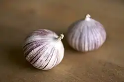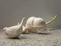 Garlic (Allium sativum) is a species of bulbous flowering plants in the genus Allium. Its close relatives include the onion, shallot, leek, chives,[2] Welsh onion, and Chinese onion.[3] Garlic is native to central and south Asia, stretching from the Black Sea through the southern Caucasus, northeastern Iran, and the Hindu Kush;[1][4][5] it also grows wild in parts of Mediterranean Europe.[6] There are two subspecies and hundreds of varieties of garlic.
