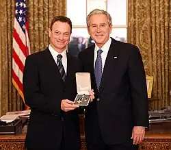 Sinise was awarded the Presidential Citizens Medal by President George W. Bush for work he did supporting the U.S. military and humanitarian work supporting Iraqi children.[21] He narrated Army and Army Reserve Army Strong recruitment ads[22] in late 2008.