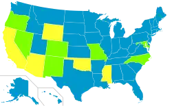 As of 2020, the last person to be executed in the gas chamber was German national Walter LaGrand, sentenced to death before 1992, who was executed in Arizona on March 3, 1999. The U.S. Court of Appeals for the Ninth Circuit had ruled that he could not be executed by gas chamber, but the decision was overturned by the United States Supreme Court.[22] The gas chamber was formerly used in Colorado, Maryland, Nevada, New Mexico, North Carolina and Oregon. Seven states (Alabama, Arizona, California, Mississippi, Missouri, Oklahoma, and Wyoming) authorize lethal gas if lethal injection cannot be administered, the condemned committed their crime before a certain date, or the condemned chooses to die in the gas chamber.[27] Alabama, Mississippi, and Oklahoma specify the nitrogen hypoxia method, Arizona specifies the hydrogen cyanide method, and the other states do not specify the type of gas.[28] In October 2010, Governor of New York David Paterson signed a bill rendering gas chambers illegal for use by humane societies and other animal shelters.[29]