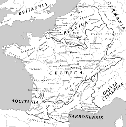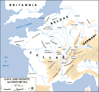 A map of Gaul in the 1st century BC, showing the relative positions of the Celtic ethnicities: Celtae, Belgae and Aquitani.