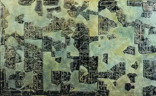 According to Recueil des inscriptions gauloises more than 760 Gaulish inscriptions have been found throughout France, with the notable exception of Aquitaine, and in northern Italy.[53] Inscriptions include short dedications, funerary monuments, proprietary statements, and expressions of human sentiments, but also some longer documents of a legal or magical-religious nature,[3] the three longest being the Larzac tablet, the Chamalières tablet and the Lezoux dish. The most famous Gaulish record is the Coligny calendar, a fragmented bronze tablet dating from the 2nd century AD and providing the names of Celtic months over a five-year span; it is a lunisolar calendar trying to synchronize the solar year and the lunar month by inserting a thirteenth month every two and a half years. There is also a longish (11 lines) inscribed tile from Châteaubleau that has been interpreted as a curse or alternatively as a sort of wedding proposal.[54]