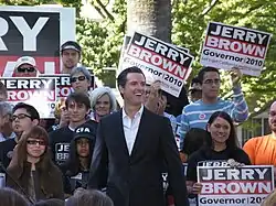 On April 21, 2009, Newsom announced his candidacy for governor of California in the 2010 election.[92] He named state senator (and future U.S. senator) Alex Padilla to chair his campaign.[93] He received former president Bill Clinton's endorsement in September. Throughout the campaign, he had low poll numbers, trailing Democratic frontrunner Jerry Brown by more than 20 points in most polls.[94][95][96] Newsom dropped out of the race in October and ran for lieutenant governor instead.[97][98][99]