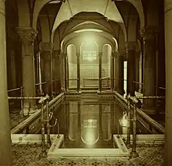 In London, the Savoy Victorian-style Turkish Baths at 92 Jermyn Street became a favorite spot (opening in 1910 and remaining open until September 1975).[15] The journalist A.J. Langguth wrote: "...[The baths at 92 Jermyn Street] represented a twilight arena for elderly men who came to sweat poisons from their systems and youths who came to strike beguiling poses in Turkish towels... although they were closely overseen by attendants, they provided a discreet place to inspect a young man before offering a cup of tea at Lyons."[16] Regulars included Rock Hudson.[17][18]