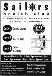 Steambaths in the 1930s: The steambaths that had been well known to me were those of East Ham, Greenwich and Bermondsey. In the first two it was frequently possible to indulge in what the Spartacus Guide coyly describes as 'action', but behaviour at all times had to be reasonably cautious. In the Grange Road baths in Bermondsey, however, all restraint could immediately be discarded with the small towels provided to cover your nakedness."[20]