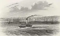A paddlesteamer approaches busy Geelong Harbour in 1857.