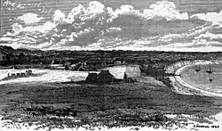 In March 1836, three squatters, David Fisher, James Strachan, and George Russell, arrived on Caledonia and settled the area.[26] Geelong was first surveyed by Assistant Surveyor W. H. Smythe three weeks after Melbourne, and was gazetted as a town on 10 October 1838.[14] There was already a church, hotel, store, wool store, and 82 houses, and the town population was 545.[14] By 1841, the first wool had been sent to England and a regular steamer service was running between Geelong and Melbourne.[32] Captain Foster Fyans was commissioned as the local Police Magistrate in 1837 and established himself on the Barwon River at the site of the area of present-day Fyansford.[34] Fyans arranged the first muster of the Indigenous population and 275 Aboriginal people were found to be living in the area. Fyans distributed blankets, sugar and flour to these people but soon ordered his soldiers to "click their triggers" at them when a lack of blankets caused anger.[35] Fyans constructed a breakwater to improve the water supply to the city by preventing the salty lower reaches from mixing with fresh water and pooling water. In 1839, Charles Sievwright, the newly appointed Assistant Protector of Aborigines (for the western district) sets up camp on the Barwon River near Fyans ford.