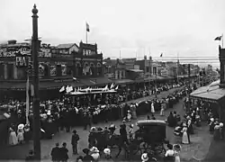 The town of Geelong officially became a city on 8 December 1910.[49][50] The city gained a number of essential services, with electric light supplied by the Geelong Power Station starting in 1902, the Geelong Harbour Trust was formed in December 1905,[51] and the Geelong Waterworks and Sewerage Trust formed in 1908. Electric trams began operation in 1912, travelling from the city centre to the suburbs until their demise in 1956.[52] The first of many stores on the Market Square was opened in 1913,[19] and the first Gala Day festival was held in 1916.[19]
