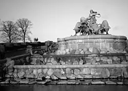 Gefjon appears prominently as the allegorical mother of Norway, Sweden, and Denmark in the forty-page Swedish Romantic poem Gefion, a Poem in Four Cantos by Eleonora Charlotta d'Albedyhll (1770–1835).[36] A fountain depicting Gefjun driving her oxen sons to pull her plough (The Gefion Fountain, 1908) by Anders Bundgaard stands in Copenhagen, Denmark, on the island of Zealand, as in the myth.[37] The Gefion family, a family of asteroids,[38] and asteroid 1272 Gefion (discovered in 1931 by Karl Wilhelm Reinmuth[39]) both derive their names from that of the goddess.