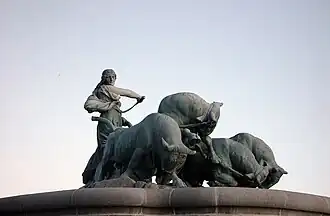 In Norse mythology, Gefjon (Old Norse: [ˈɡevˌjon]; alternatively spelled Gefion, or Gefjun [ˈɡevjon], pronounced without secondary syllable stress) is a goddess associated with ploughing, the Danish island of Zealand, the legendary Swedish king Gylfi, the legendary Danish king Skjöldr, foreknowledge, her oxen children, and virginity. Gefjon is attested in the Poetic Edda, compiled in the 13th century from earlier traditional sources; the Prose Edda and Heimskringla, written in the 13th century by Snorri Sturluson; in the works of skalds; and appears as a gloss for various Greco-Roman goddesses in some Old Norse translations of Latin works.