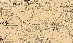 The Valley of Hinnom identified with the Wadi er Rababi, in a 1940s Survey of Palestine map