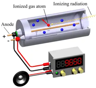 It detects ionizing radiation such as alpha particles, beta particles, and gamma rays using the ionization effect produced in a Geiger–Müller tube, which gives its name to the instrument.[2]
