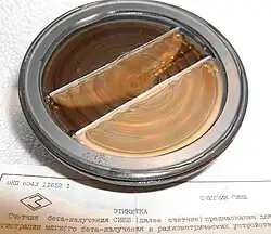 Pancake G-M tube used for alpha and beta detection; the delicate mica window is usually protected by a mesh when fitted in an instrument.