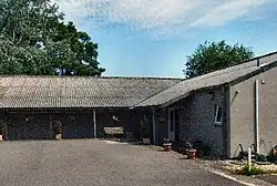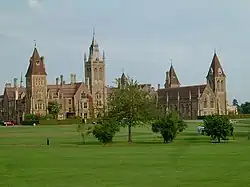 In June 1974, Genesis started work on their double concept album The Lamb Lies Down on Broadway.[91] This marked a point at which Gabriel's relationship with the rest of the group became increasingly strained, which contributed to his departure. The album was written at Headley Grange in East Hampshire, where upon their arrival the building had been left in a very poor state by the previous band, with rat infestations and excrement on the floor.[92] Gabriel objected to Rutherford's idea of an album based on The Little Prince by Antoine de Saint-Exupéry, thinking the idea was "too twee".[93] He proposed to the band a less fantastical and more complicated story involving Rael, a Puerto Rican youth living in New York City who embarks on a spiritual quest to establish his freedom and identity while meeting several bizarre characters on the way.[94] Gabriel wrote the story with influences from West Side Story, "a kind of punk" twist to Pilgrim's Progress, author Carl Jung and the film El Topo by Alejandro Jodorowsky.[95] Most of the album's lyrics were written by Gabriel, leaving much of its music to the rest of the group. His absence from a considerable amount of writing sessions due to difficulties with his wife's first birth was something about which Rutherford and Banks "were horribly unsupportive".[96] Gabriel also left the group when director William Friedkin asked him to write a screenplay, but returned after the project was shelved.[97] In August 1974, production moved to Glaspant Manor in Carmarthenshire, Wales[98] with Burns as co-producer, operating Island Studios' mobile equipment. Further work and mixing took place at Island, where Brian Eno contributed synthesizers and effects that the album's sleeve credits as "Enossification". When Gabriel asked Eno how the band could repay him, Eno said he needed a drummer for his track "Mother Whale Eyeless". Collins said, "I got sent upstairs as payment".[99] Gabriel was pleased with Eno's work but Banks was less enthusiastic.[100]