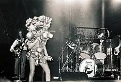 The Foxtrot tour covered Europe and North America from September 1972 to August 1973. Gabriel surprised the other members of the band at the National Stadium in Dublin on 28 September 1972 by wearing a costume on stage, following a suggestion by Charisma booking agent Paul Conroy. He went off stage during an instrumental section in "The Musical Box" and reappeared in his wife's red dress and a fox's head.[75] The incident resulted in front cover reports in the music press, allowing the band to double their performance fee.[76] In December 1972 Stratton Smith organised the band's first gigs in the US, with a show at Brandeis University in Waltham, Massachusetts and one at Philharmonic Hall in New York City with openers String Driven Thing, in aid of the United Cerebral Palsy Fund.[77] They were well received despite the band complaining of technical issues.[78] Gabriel's costumes expanded in the following months to include fluorescent face paint and a cape fitted with bat wings for "Watcher of the Skies", several guises throughout "Supper's Ready" and a mask of an old man for "The Musical Box".[79] An album of recordings from the following UK leg, initially recorded for the American radio programme King Biscuit Flower Hour, was released as Genesis Live in July 1973.[80] It reached No. 9 in the UK[31] and No. 105 in the US.[31]