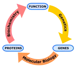 Schematic relationship between biochemistry, genetics and molecular biology