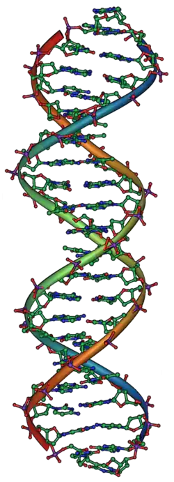 DNA, the molecular basis for biological inheritance. Each strand of DNA is a chain of nucleotides, matching each other in the center to form what look like rungs on a twisted ladder.