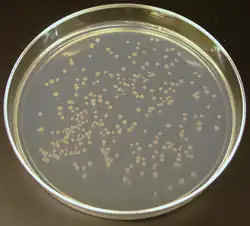 Colonies of E. coli produced by cellular cloning. A similar methodology is often used in molecular cloning.