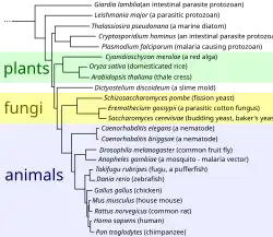 An evolutionary tree of eukaryotic organisms, constructed by the comparison of several orthologous gene sequences
