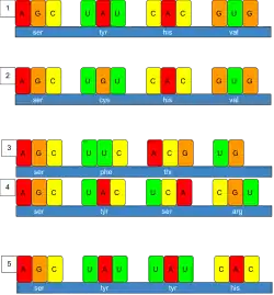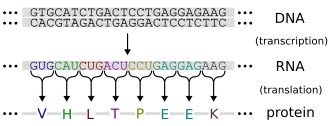 Although the structure of DNA showed how inheritance works, it was still not known how DNA influences the behavior of cells. In the following years, scientists tried to understand how DNA controls the process of protein production.[35] It was discovered that the cell uses DNA as a template to create matching messenger RNA, molecules with nucleotides very similar to DNA. The nucleotide sequence of a messenger RNA is used to create an amino acid sequence in protein; this translation between nucleotide sequences and amino acid sequences is known as the genetic code.[36]