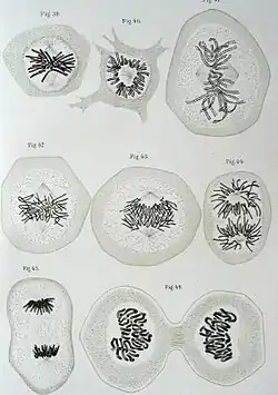 Walther Flemming's 1882 diagram of eukaryotic cell division. Chromosomes are copied, condensed, and organized. Then, as the cell divides, chromosome copies separate into the daughter cells.