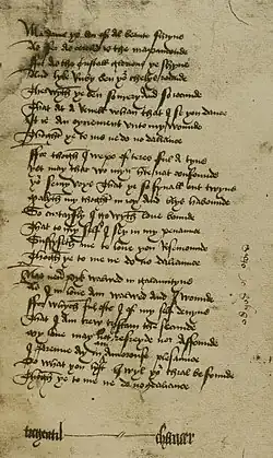 On 16 October 1379 Thomas Staundon filed legal action against his former servant Cecily Chaumpaigne and Chaucer, accusing the latter of unlawfully employing Chaumpaigne before her term of service was completed, in violation of the Statute of Labourers.[33] Though eight court documents dated between October 1379 and July 1380 survive the action,[34] the case was never prosecuted. No details survive about Chaumpaigne's service or how she came to leave Staundon's employ for Chaucer's.[35][a]