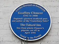 Blue plaque at the site of the Tabard inn in Southwark, London, where in 1386 the pilgrims in The Canterbury Tales set off to visit Canterbury Cathedral
