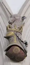 The Chaucer crest: A unicorn's head with canting arms of Roet below: Gules, three Catherine Wheels or (French: rouet = 'spinning-wheel'). Ewelme Church, Oxfordshire; possible funeral helm of his son Thomas Chaucer.