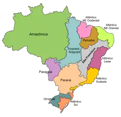 According to organs of the Brazilian government there are 12 major hydrographic regions in Brazil. Seven of these are river basins named after their main rivers; the other five are groupings of various river basins in areas which have no dominant river.