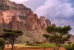 The western wall of the plateau from 6° N to 11° N is well marked and precipitous. North of 11° N the hills turn more to the east and fall more gradually to the East Sudanian savanna plains at their base. On its northern face, the plateau falls in terraces to the level of the eastern Sudan.