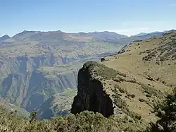Characteristic of the country are the enormous fissures which divide it, formed over time by the erosive action of water. They are the valleys of the rivers, which rising on the uplands or mountain sides, have cut their way to the surrounding lowlands. Some of the valleys are of considerable width; in other cases the opposite walls of the gorges are but two or three hundred meters apart, and fall almost vertically thousands of meters, representing an erosion of many hundred thousands cubic metres of hard rock. One result of the action of the water has been the formation of numerous isolated flat-topped hills or small plateaus, known as ambas, with nearly perpendicular sides.[4]