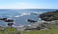 Mainland Scotland has 6,160 miles (9,910 km) of coastline. Including the numerous islands, this increases to some 11,602 miles (18,672 km).[16] The west coast in particular is heavily indented, with long promontories separated by fjordlike sea lochs. The east coast is more regular, with a series of large estuarine inlets, or firths, and long sandy beaches, for example at Aberdeen. Parts of the Scottish coastline consist of a machair formation, a dune pasture land formed as sea levels subsided.[17]