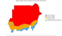 This article incorporates text from this source, which is in the public domain: Bechtold, Peter K. (2015). "Climate" (PDF). In Berry, LaVerle (ed.). Sudan: a country study (5th ed.). Washington, D.C.: Federal Research Division, Library of Congress. pp. 70–71. ISBN 978-0-8444-0750-0. Though published in 2015, this work covers events in the whole of Sudan (including present-day South Sudan) until the 2011 secession of South Sudan.