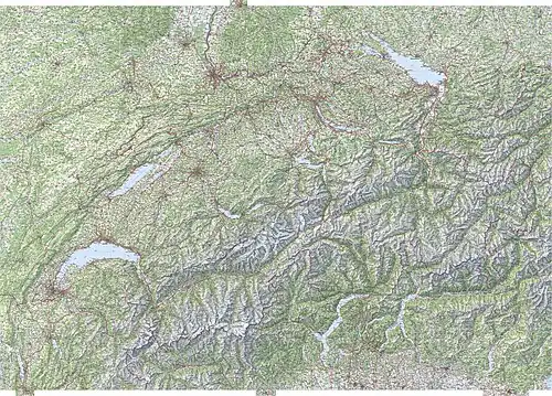 The plateau occupies about one third of the land area of Switzerland, and about two thirds of the population live in this area. The population density on the plateau averages about 450 people per km2 (1,166 per square mile).[7] In the regions around Lake Geneva, Lake Zurich and other cities, the population density exceeds 1000 people per km2.[8] As well as the majority of the population, the Swiss Plateau is also home to the majority of industry, manufacturing and farming in Switzerland. The farms are generally small and very organized. Most farms include small meadows alternating with fields with a variety of crops and small wooded areas.