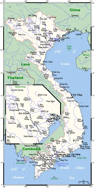 The joined Delta of Hong River (Red River) and Thái Bình River is a flat, triangular region of 15,000 square kilometres (5,800 sq mi).[1] The Hong River Delta is smaller but more intensely developed and more densely populated than the Mekong Delta. Once an inlet of the Gulf of Tonkin, it has been filled in by the enormous alluvial deposits of the rivers over a period of millennia, and it advances one hundred meters into the Gulf annually.[2] The ancestral home of the ethnic Vietnamese, the delta accounted for almost 70% of the agriculture and 80% of the industry of North Vietnam before 1975.