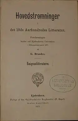 In the middle of these polemics, Brandes began to issue volumes of the most ambitious of his works, Main Currents in the Literature of the Nineteenth Century, of which four volumes appeared between 1872 and 1875 (English translation,[4] 1901–1905). The brilliant novelty of this criticism of the literature of major European countries at the beginning of the 19th century, and his description of the general revolt against the pseudo-classicism of the 18th century, at once attracted attention outside Denmark. The tumult which gathered round the person of the critic increased the success of the work, and the reputation of Brandes grew apace, especially in Germany and Russia.[1]