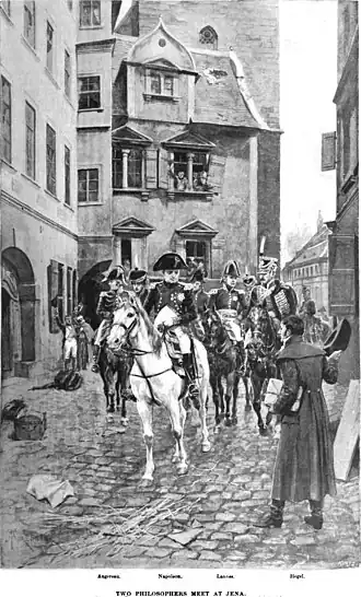 In 1801, Hegel came to Jena at the encouragement of Schelling, who held the position of Extraordinary Professor at the University of Jena.[5] Hegel secured a position at the University of Jena as a Privatdozent (unsalaried lecturer) after submitting the inaugural dissertation De Orbitis Planetarum, in which he briefly criticized mathematical arguments that assert that there must exist a planet between Mars and Jupiter.[23][b] Later in the year, Hegel's essay The Difference Between Fichte's and Schelling's System of Philosophy was completed.[25] He lectured on "Logic and Metaphysics" and gave lectures with Schelling on an "Introduction to the Idea and Limits of True Philosophy" and facilitated a "philosophical disputorium."[25][26] In 1802, Schelling and Hegel founded the journal Kritische Journal der Philosophie (Critical Journal of Philosophy) to which they contributed until the collaboration ended when Schelling left for Würzburg in 1803.[25][27] In 1805, the university promoted Hegel to the unsalaried position of extraordinary professor after he wrote a letter to the poet and minister of culture Johann Wolfgang von Goethe protesting the promotion of his philosophical adversary Jakob Friedrich Fries ahead of him.[28] Hegel attempted to enlist the help of the poet and translator Johann Heinrich Voß to obtain a post at the renascent University of Heidelberg, but he failed. To his chagrin, Fries was, in the same year, made ordinary professor (salaried).[29] The following February marked the birth of Hegel's illegitimate son, Georg Ludwig Friedrich Fischer (1807–1831), as the result of an affair with Hegel's landlady Christiana Burkhardt née Fischer.[30] With his finances drying up quickly, Hegel was under great pressure to deliver his book, the long-promised introduction to his philosophical system.[31] Hegel was putting the finishing touches to it, The Phenomenology of Spirit, as Napoleon engaged Prussian troops on 14 October 1806 in the Battle of Jena on a plateau outside the city.[11] On the day before the battle, Napoleon entered the city of Jena. Hegel recounted his impressions in a letter to his friend Friedrich Immanuel Niethammer: