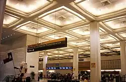Ed Carpenter's Light Wings, a multicolored glass sculpture suspended below a skylight, adorns the Terminal A North Concourse.[68] In Terminal A, South Concourse stands Terry Allen's Countree Music. Allen's piece is a cast bronze tree that plays instrumental music by Joe Ely and David Byrne, though the music is normally turned off. The corridor leading to Terminal A displays Leamon Green's Passing Through, a 200-foot (61 m) etched glass wall depicting airport travelers.[69]