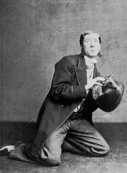 Grossmith also wrote, composed, and performed in several one-man drawing room sketches, short comic operas or monologues that were given at the Opera Comique or the Savoy Theatre in place of the companion pieces when shorter matinee programmes were playing. These works included Beauties on the Beach (1878),[10] Five Hamlets (1878),[10] a revival of his A Silver Wedding (1879), The Drama on Crutches (1883), Homburg, or Haunted by The Mikado (1887–88),[10][35] and Holiday Hall (1888).[11] In reviewing a matinee performance of The Drama on Crutches, The Times commented, "he not only satirizes the present tendency of fashionable amateurs to join the stage, but also parodies ... the manner of Mr. Irving and other actors of the present day, including himself. The sketch created great amusement, though of course, it depends entirely for its success upon the actor's powers of mimicry."[28] Grossmith also performed in charity events, including as Bouncer in Cox and Box in 1879 at the Opera Comique.[11]