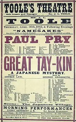 During his time with the D'Oyly Carte Opera Company, Grossmith's father and mother died (in 1880 and 1882, respectively). Throughout this period, Grossmith continued to perform his sketches, often late at night after performing at the Savoy, and continued to write new sketches, such as Amateur Theatricals (1878), A Juvenile Party (1879), A Musical Nightmare (1880), and A Little Yachting (1886).[33] He also wrote the music for Arthur Law's short comic opera, Uncle Samuel (1881), the one-act curtain raiser that preceded Patience on the Opera Comique programme. His Cups and Saucers was revived and played with Pinafore and also played by the company on tour. Other comic operas by Grossmith during these years included Mr Guffin's Elopement (1882) and A Peculiar Case (1884, both with libretti by Arthur Law) and The Real Case of Hide and Seekyll (1886).[33] Grossmith also continued to give his "society" and other entertainments, often late at night after his performance at the Savoy. He also composed the music for another comic opera, The Great Tay-Kin and another piece, both with libretti by Arthur Law, which were performed at Toole's Theatre in 1885.[34]