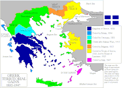 Expansion of the Greek kingdom from 1832 to 1947. Thessaly transferred from Ottoman to Greek sovereignty in 1881.