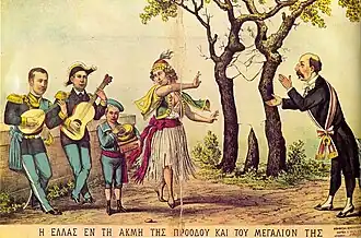 Greek satirical cartoon of the 1880s. The legend reads "Greece at the peak of its progress and its greatness". The Greek royal princes play music to which the country dances, while Prime Minister Trikoupis applauds and King George I is shown in an olive tree, the symbol of Trikoupis's party.
