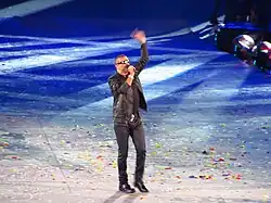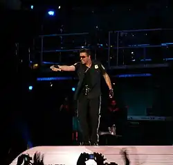 Michael performed with Queen at The Freddie Mercury Tribute Concert on 20 April 1992 at Wembley Stadium.[79] The concert was a tribute to the life of the late Queen frontman, Freddie Mercury, with the proceeds going to AIDS research.[80] Michael performed "'39", "These Are the Days of Our Lives" with Lisa Stansfield and "Somebody to Love". Michael's performance of "Somebody to Love" was hailed as "one of the best performances of the tribute concert".[81][82] Michael later reflected, "It was probably the proudest moment for me of my career, because it was me living out a childhood fantasy, I suppose, to sing one of Freddie's songs in front of 80,000 people."[83]