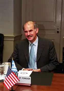 Belonging to a political dynasty of long standing, he served under his father, then-prime minister Andreas Papandreou as Minister for National Education and Religious Affairs (1988–1989 and 1994–1996). He served as Minister for Foreign Affairs under Prime Minister Costas Simitis from 1999 to 2004. Papandreou was leader of the Panhellenic Socialist Movement (PASOK) party, which his father founded, from February 2004 until March 2012, and president of the Socialist International from 30 January 2006 to 25 November 2022.[5]