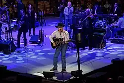 In November 2013, Billboard presented Strait with its Legend of Live honor during the 10th annual Billboard Touring Awards ceremony.[49] The award honors the concert industry's top artist based on Billboard's Boxscore chart and box-office performance.[50] Strait is the first country artist to receive Billboard's highest touring accolade.[51] On April 19, 2015, Strait made a guest appearance at the 2015 ACM Awards, he performed "All My Ex's Lives in Texas" and his new single "Let it Go".[52]